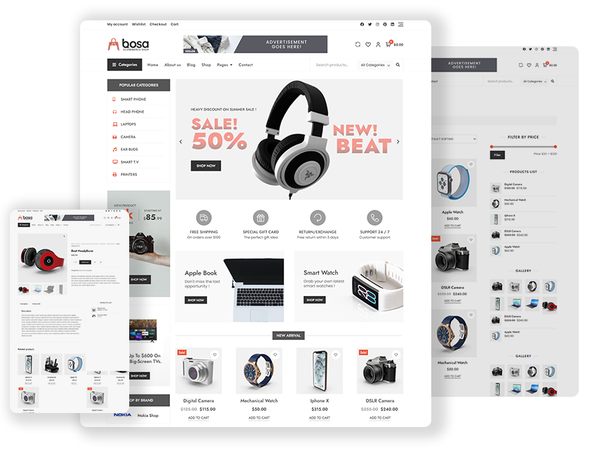 Bosa Ecommerce Shop is multipurpose eCommerce theme. Bosa Ecommerce Shop is beautiful, fast, lightweight, responsive, extremely customizable theme that you can use as a foundation to build versatile sites such as e-commerce, beauty products, women’s fashion, smart home products, sports, toy shops, gadgets stores, jewelry shops, men’s clothing, electronics, furniture, retail, digital products and preferably ideal for any type of eCommerce sites. Bosa Ecommerce Shop is a child theme of Bosa, a free multipurpose WordPress theme. Bosa Ecommerce Shop works perfectly with Gutenberg and the most popular page builder Elementor that can easily drag-and-drop your ideas from the interface. Bosa Ecommerce Shop is built with SEO, speed, and usability in mind with the multiple Header & Footer layouts, predesigned starter sites includes awesome Home & Inner Pages that is incredibly customizable and powerful enough to take a stand among the crowd. Bosa Ecommerce Shop is compatible with all major plugins like WooCommerce, Yoast, Contact form 7, Mailchimp for WordPress, bbPress, etc. Looking for a Multipurpose eCommerce theme? Look no further!